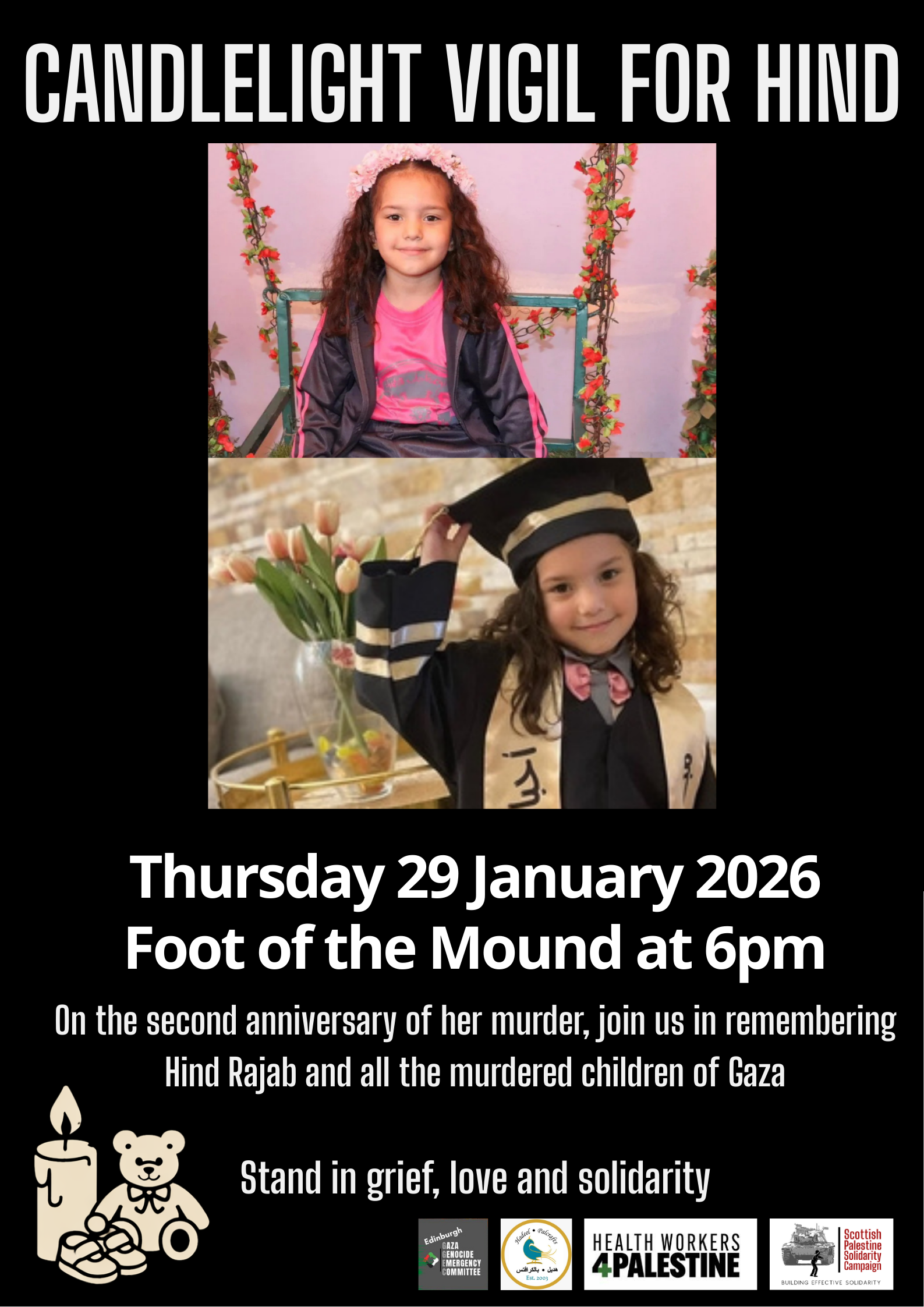 Candlelight Vigil for Hind Rajab We invite you to join us for a candlelight vigil in memory of Hind Rajab, held on the second anniversary of her death. Hind was only five years old when she was murdered by Israeli occupation forces. Trapped in a car and pleading for help. She was shot at over […]