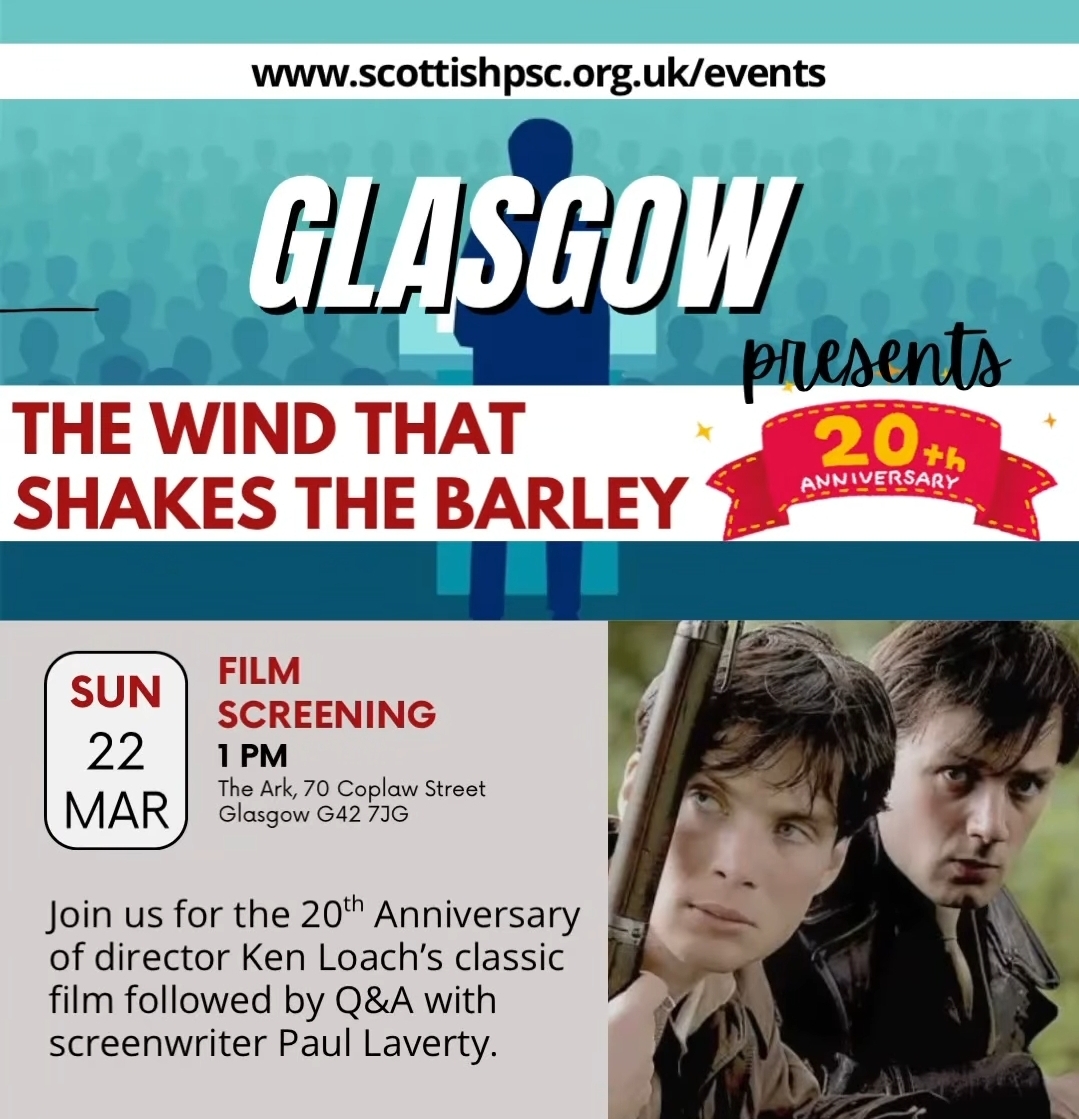 Mar 22 13:00 - 15:00 The Wind that Shakes The Barley: Film screening & Q&A with Paul Laverty The Ark 70 Coplaw Street, Glasgow Event Details Get Directions