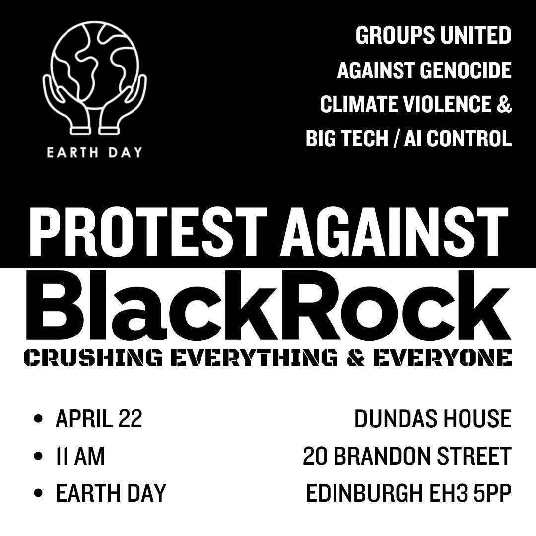 Protest at BlackRock's Edinburgh offices on Earth Day Join XR Scotland, Christian Climate Action, Scottish Palestine Solidarity Campaign and other groups on Earth Day, Wednesday 22nd April. Black Rocks is […]