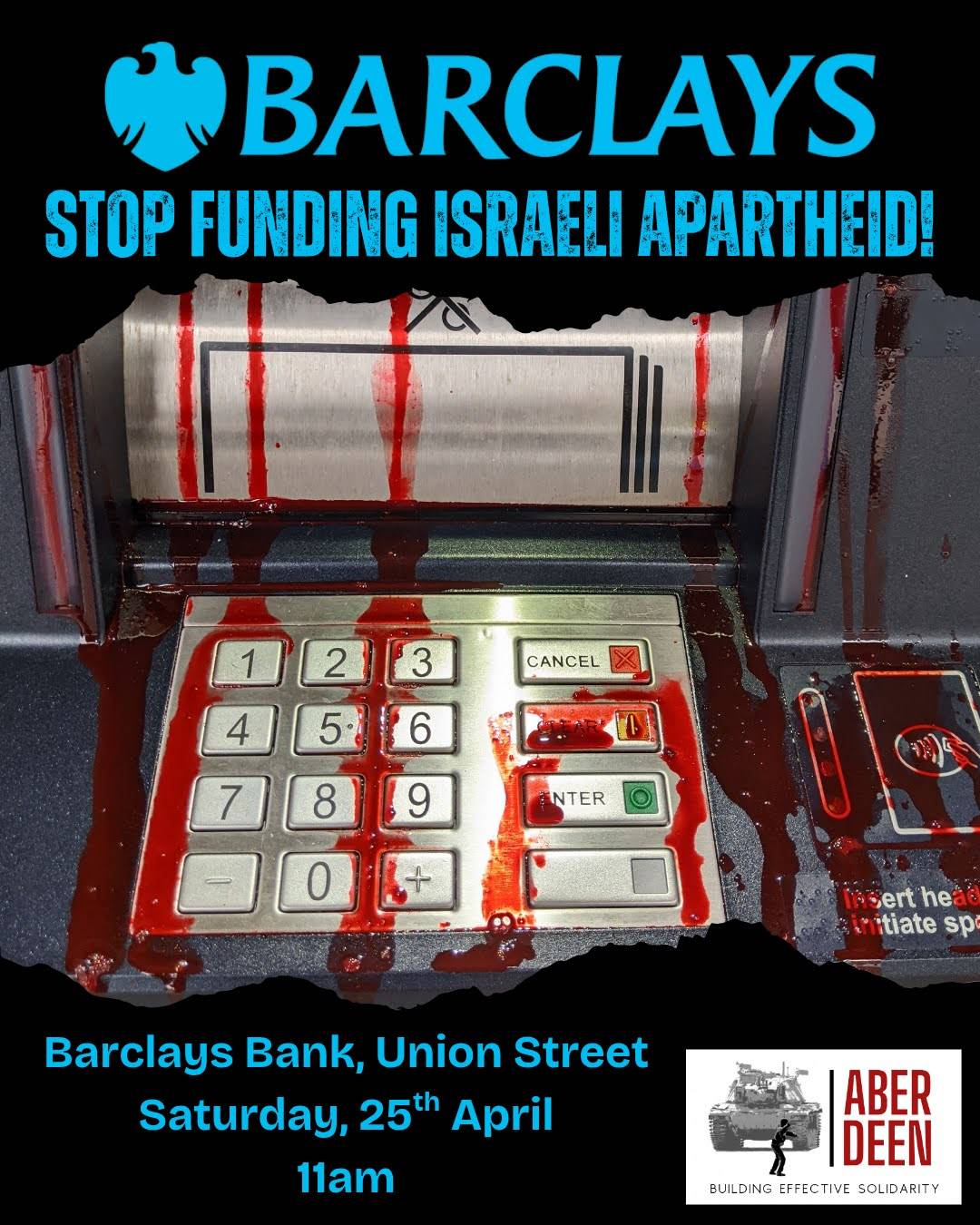 Apr 25 11:00 - 13:00 ABERDEEN Demo: Stop Funding Israeli Apartheid! Barclays Bank ABERDEEN 163-165 Union Street, Aberdeen Event Details Get Directions