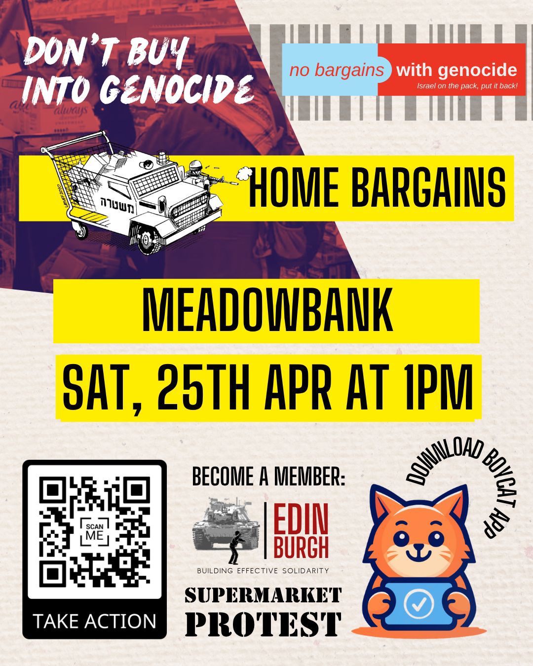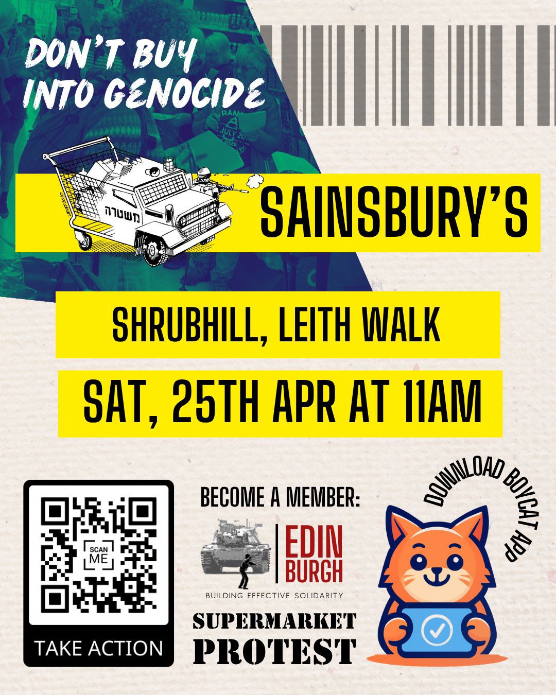 Apr 25 11:00 - 12:30 Don’t Buy Into Genocide: Edinburgh Supermarket Action Sainsbury's Local Shrubhill, Edinburgh Shrubhill, Leith Walk, Edinburgh Event Details Get Directions