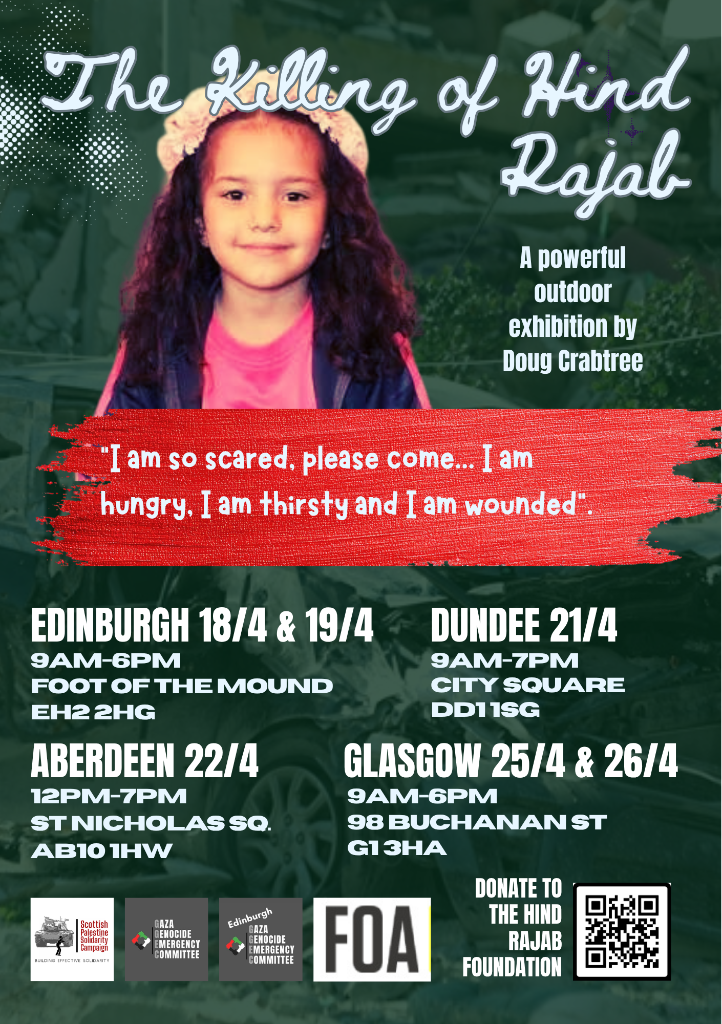 Apr 25 09:00 - 18:00 Glasgow: The Killing of Hind Rajab National Tour 98 Buchanan Street Glasgow Event Details Get Directions