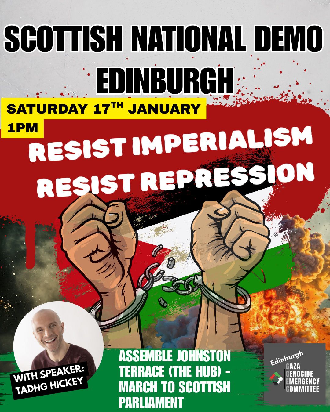 NATIONAL DEMO in EDINBURGH ALL OUT FOR PALESTINE ALL OUT AGAINST IMPERIALISM ALL OUT AGAINST REPRESSION SATURDAY 17TH JANUARY 1 PM ASSEMBLE: Johnston Terrace, EH1 2PR - for march to Scottish Parliament. As genocide continues and war escalates so does repression of Palestine solidarity and opposition to genocide, colonialism and warmongering. We will not be […]