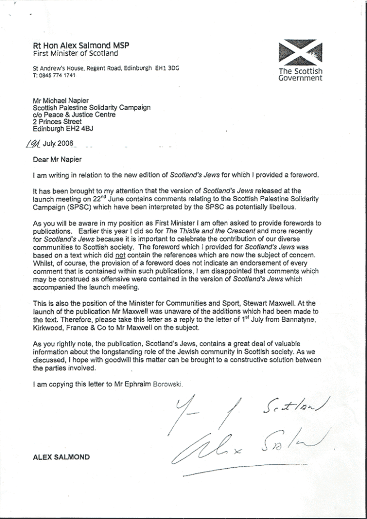 That is because SCoJeC partners with GFoI and the Israeli Embassy to exaggerate and even fabricate anti-semitism in the service of Israel during genocide. SCoJeC took the dirty tricks campaign to a new level by carrying out an audacious deception on Alex Salmond, First Minister of the Scottish Government in 2008. SCoJeC persuaded the First Minister to write a supportive foreword for a SCoJeC booklet. Someone at SCoJeC then surreptitiously inserted material into the text of 'Scotland's Jews' claiming that SPSC activities "demonised Jews". Salmond only became aware of this skulduggery when SPSC informed him that he would probably be called as a witness in a defamation case we were launching. The First Minister forced SCoJeC to pulp all 6,000 copies of the booklet, which had been published with financial support from Scottish taxpayers.