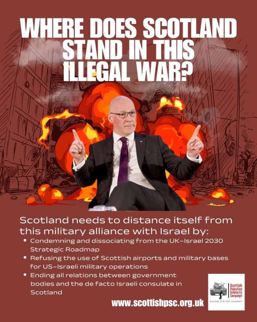 • Refusing the use of Scottish airports and military bases for US–Israeli military operations